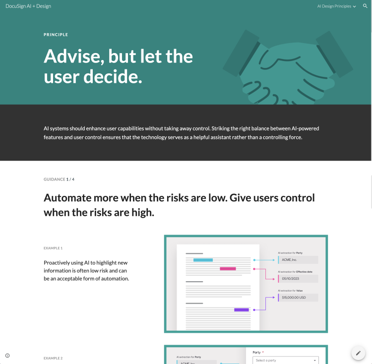 While AI was already part of DocuSign’s DNA, the LLM revolution demanded a unified, ethical, and cohesive product strategy. I co-led a 2-week sprint with a strategic task force alongside Content Design and Information Architecture leads to codify our AI Product Principles. By bridging the gap between technical capability and human-centered design, we created a foundational framework that now governs AI integration across the flagship product suite, ensuring a consistent and trustworthy user experience at scale.