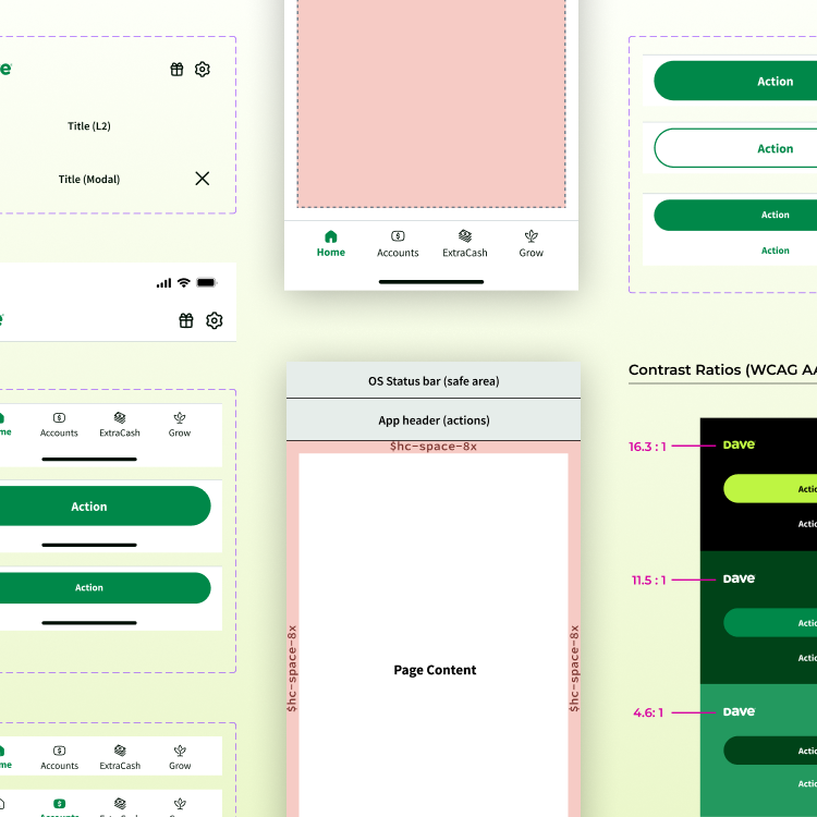 Recognizing a growing friction between design and engineering, I led a comprehensive audit of the Dave app’s navigation. In partnership with our Front-End Engineering Manager, I developed a unified framework that balances creative flexibility with technical scalability, significantly reducing cognitive load for our users and decision fatigue for our teams.